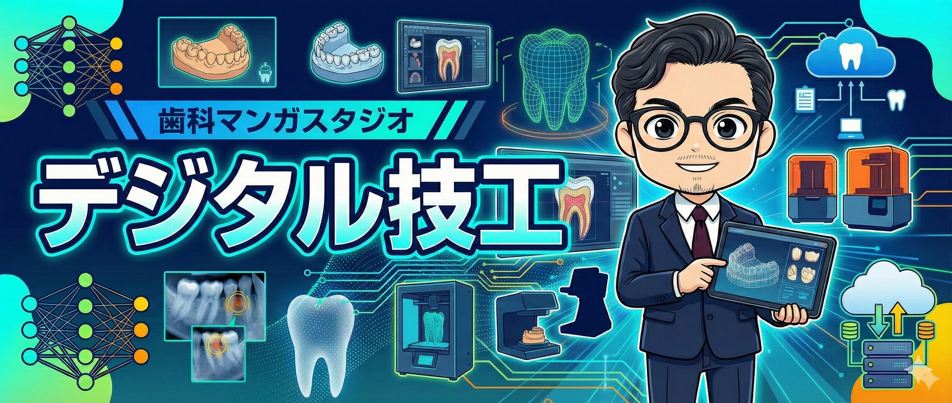 デジタル技工を担当する歯科技工士の「上岡」さんは、口腔内スキャナやCADソフト、CAMミリングマシンなどを駆使して、クラウンやインレー、インプラント上部構造を設計・製作する“デジタル技工のエキスパート”。マンガでは、「スキャンデータがどう模型になるの?」「画面上で形を整えるってどういうこと?」「アナログ指示と何が違うの?」といった疑問に答えながら、デジタル技工の流れとチェアサイドとの連携ポイントをわかりやすく解説してくれます。デジタル初心者でも、「ちょっと触ってみたい!」と思えるようなワクワク感たっぷりで案内してくれます。
