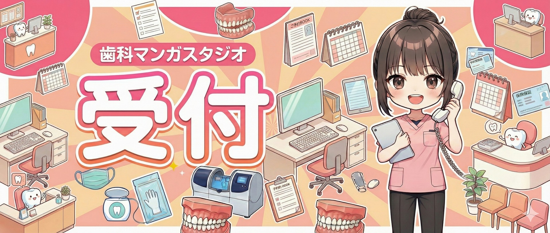 受付の「桃原 さくら」さんは、来院した瞬間からお見送りまで、患者さんと一番長く関わる“医院の顔”となる存在。予約対応や会計、電話応対でバタバタしながらも、いつも笑顔とやわらかい声かけを忘れないプロの受付さんです。マンガでは、「初診さんへのひと言目はどうする?」「予約が詰まっている時の伝え方」「クレームになりそうな場面での切り返し」など、受付ならではの難しい場面を、さくらさんの工夫とともにわかりやすく紹介。読み終わるころには、「受付ってこんなに奥が深いんだ!」と感じてもらえる役どころです。