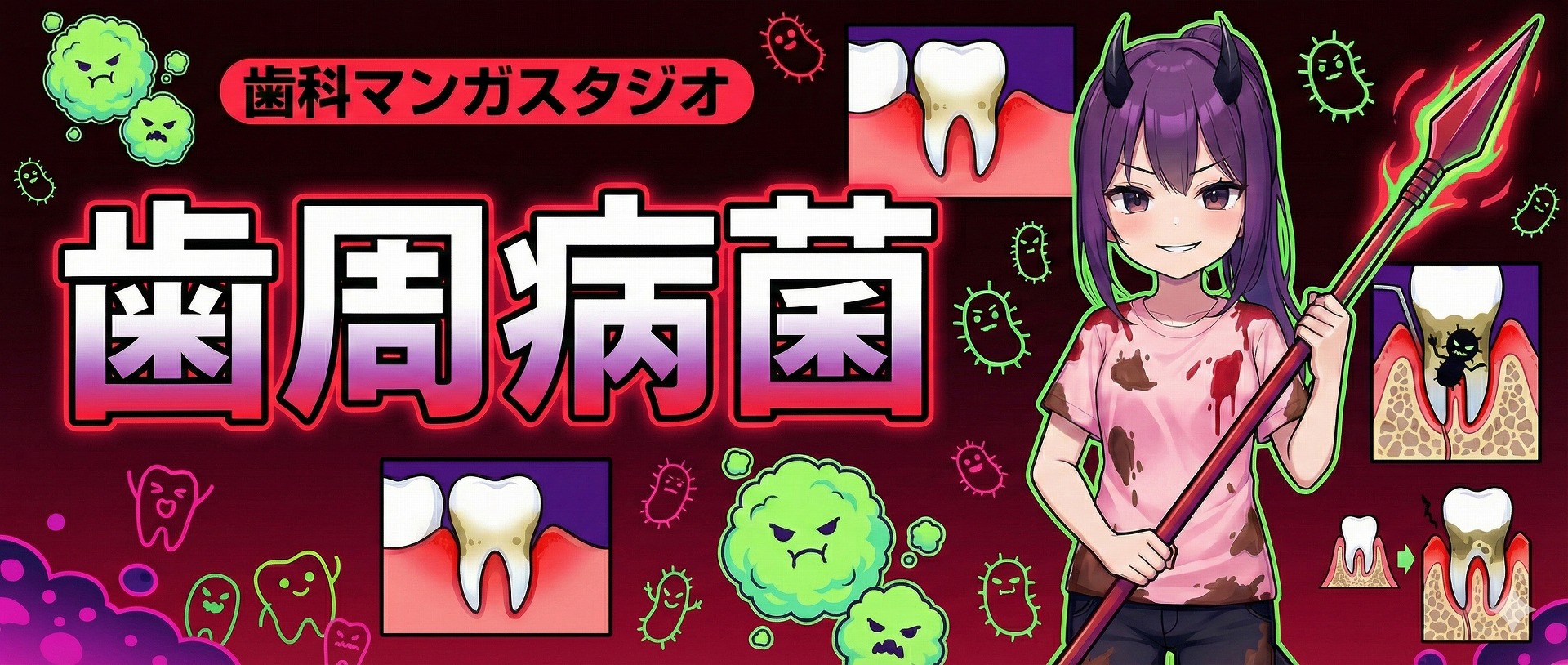 歯周病菌の「Pg菌」は、歯ぐきのスキマ(歯周ポケット)に潜む“静かな破壊者系お姉さん”。痛みがあまりないうちから、じわじわと歯ぐきや骨を攻めていく、なかなか厄介な存在です。マンガの中では、「こうやって炎症を広げていくのよ」「ここまで進むと簡単には戻れないわよ」と、少しホラーだけどどこかコミカルな口調で、自分たちの生態や攻撃パターンを解説。一方で、「そんなに丁寧に歯みがきされたら困るわ…」「定期検診なんて天敵よ!」と、予防やプロケアのポイントも“敵キャラ女子”の目線でわかりやすく教えてくれる、クセのある案内役です。